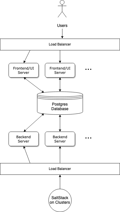 We divided the service into three parts: a backend responsible for communicating with the SaltStack masters on all our clusters, a frontend offering a web UI so that our users can manage and schedule different jobs, and finally a Postgres database to bridge between the two. We can easily put load balancers in front of the actual servers as all they are designed to share is a database.
