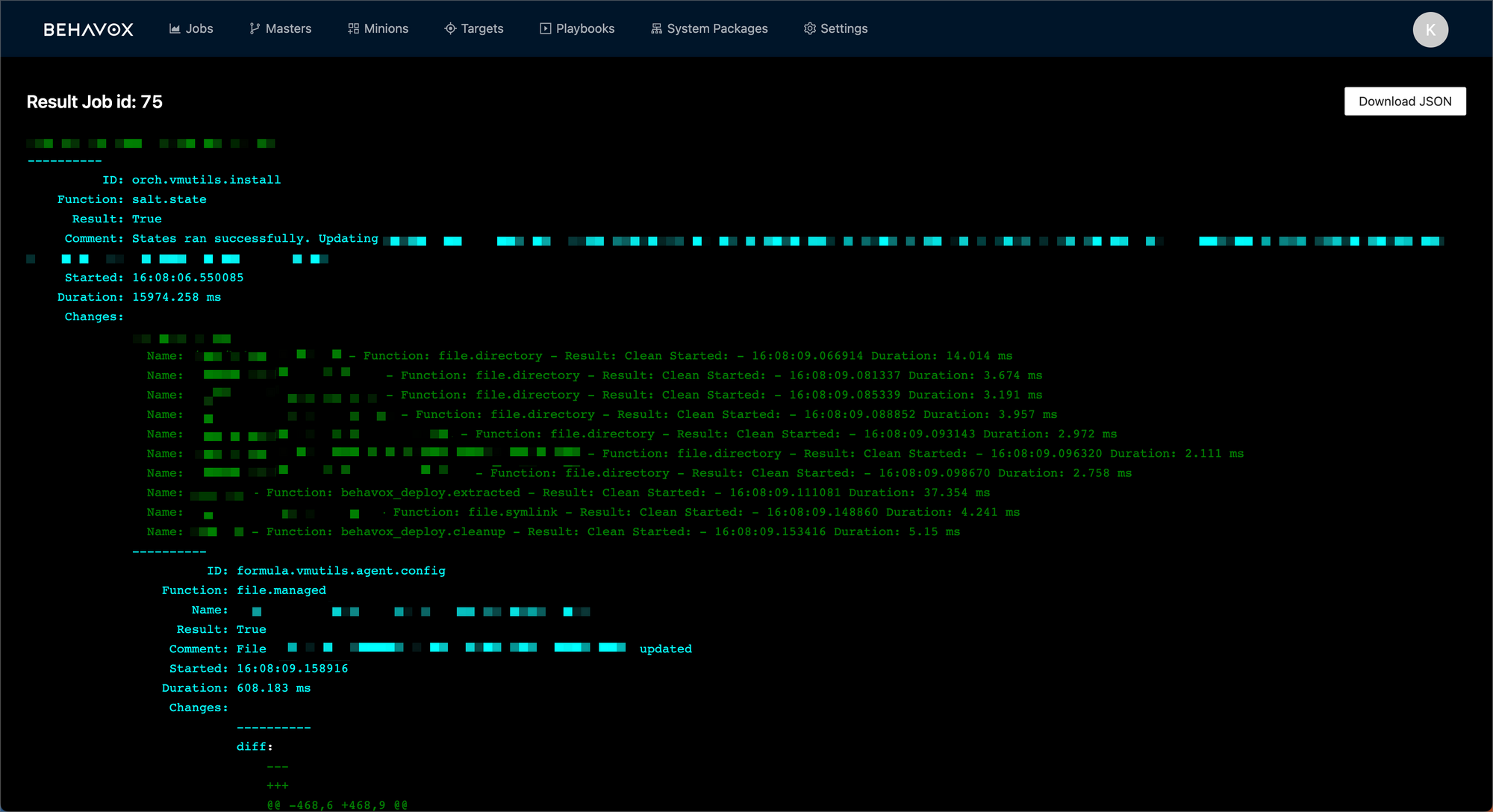 Once run (successfully, or not), the full output of any SaltStack orchestration is transmitted back from the SaltStack master to the UI, showing for any operations the full output from SaltStack which they can debug on their own time or share with a simple url.