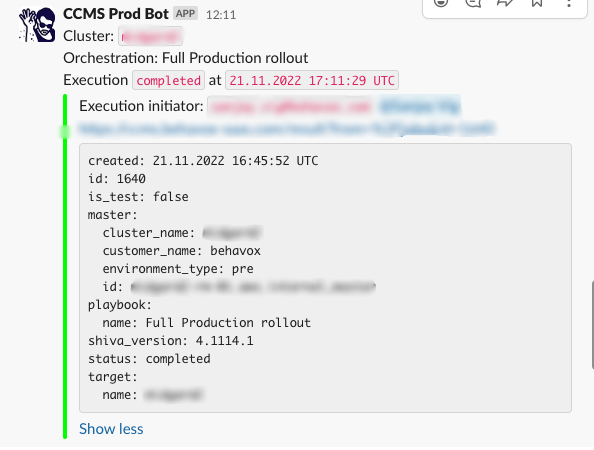 Overall, CCMS has been a very fun project at Behavox, with a quick return on our investments. With CCMS, we deploy a minor configuration change across all our clusters in less than 5 minutes, where before it would have taken the team the better part of a day to do it over the command-line with Ansible.