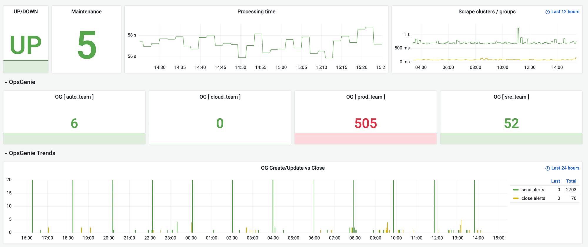 In addition to VictoriaMetrics, we have integrated Prometheus Alertmanager, configured for high availability according to best practices. Both Alertmanager instances are connected to Opsgenie, an essential part of our monitoring framework. This integration ensures timely notifications for any critical issues that require our attention.