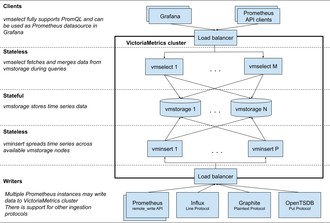 Our VictoriaMetrics setup follows a standard cluster configuration, with a vmagent deployed on each instance. We use various Prometheus exporters and a simple Python script to accommodate metrics from older applications incompatible with Prometheus (our Zabbix legacy).